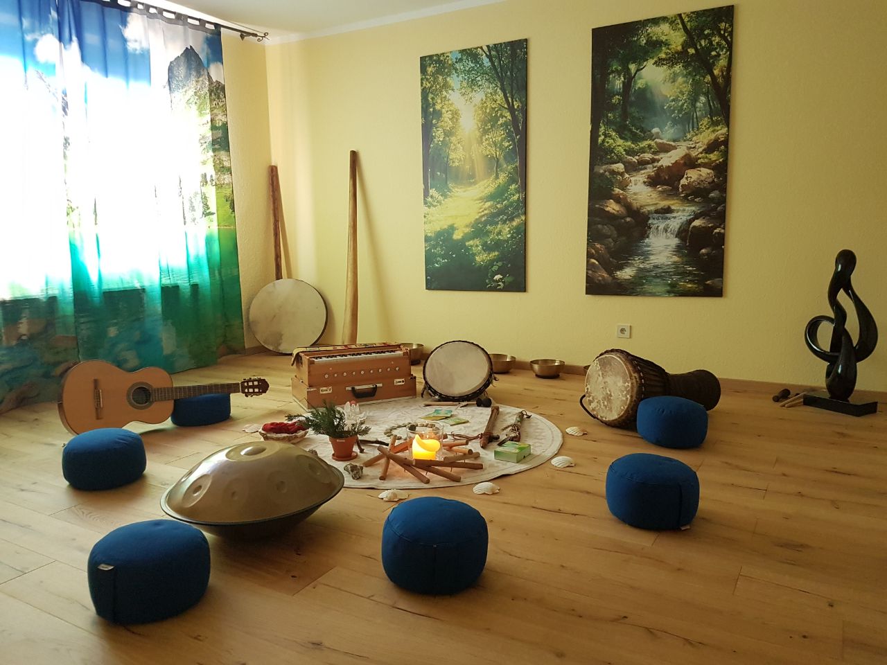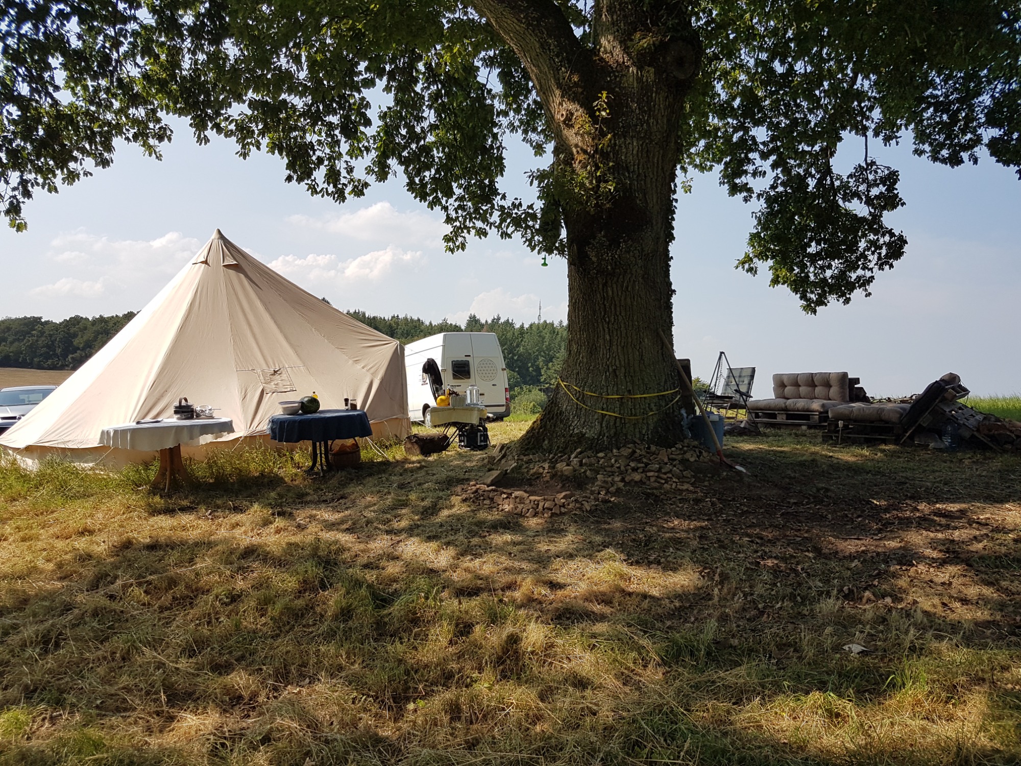 Die Zeremonien finden in unserem Paradies-Garten bei der Heiligen Eiche statt. Dort ist ein Heiliger und geschützter Raum mit einer Jurte, einem Lagerfeuer, einer Schwitzhütte mit einem Eisbad, Obstbäume und einem schützenden Wald mitsamt einer herrlichen und weiten Aussicht.